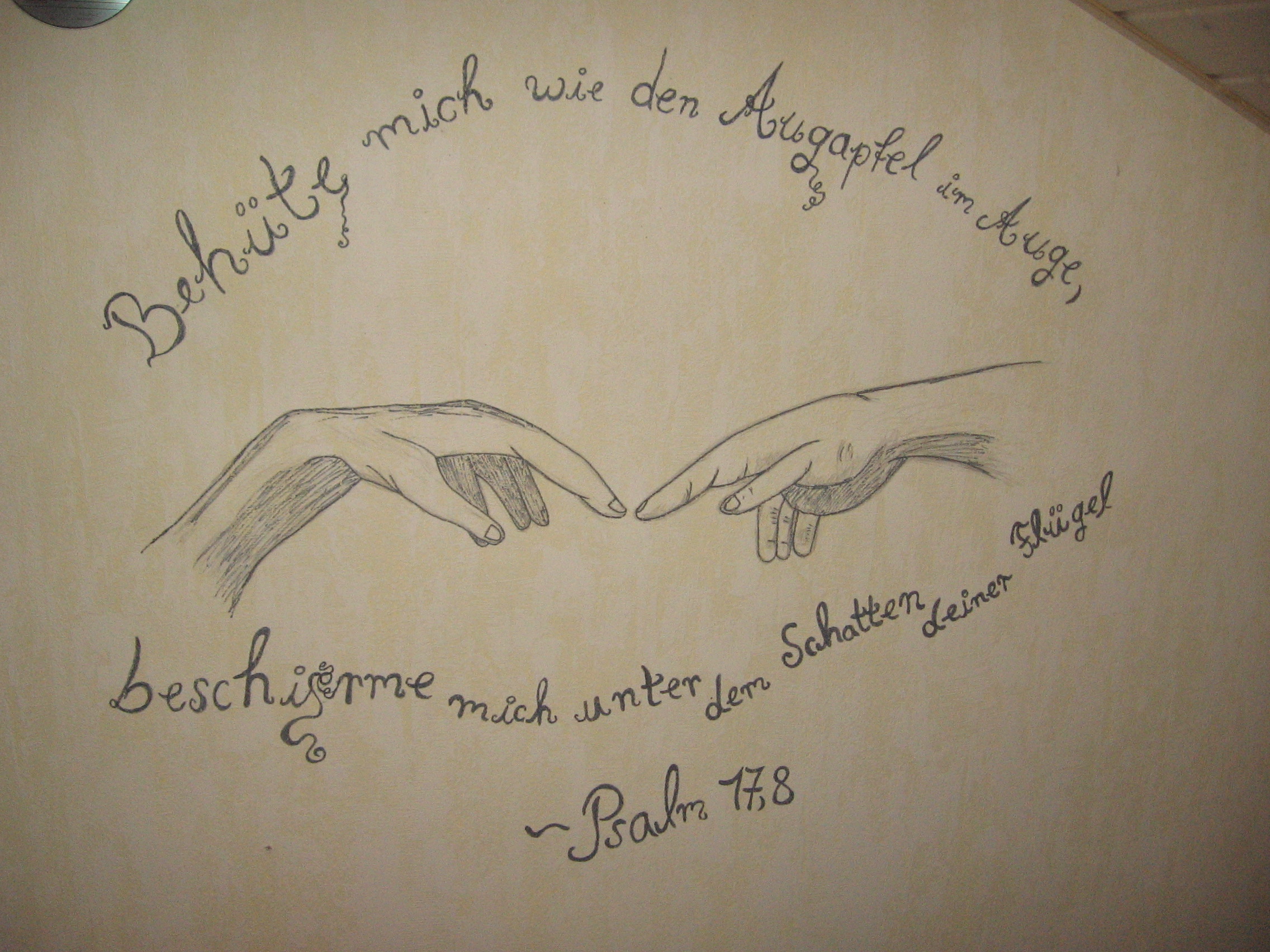 Bild an eine Zimmerwand gemalt… Symbole: Löwe und Lamm für JESUS, das Kreuz, der Regenbogen für den Bund, die Taube für den HEILIGEN GEIST, der Schmetterling für die Neugeburt im GEIST, das Wasser für die Ströme lebendigen Wassers…