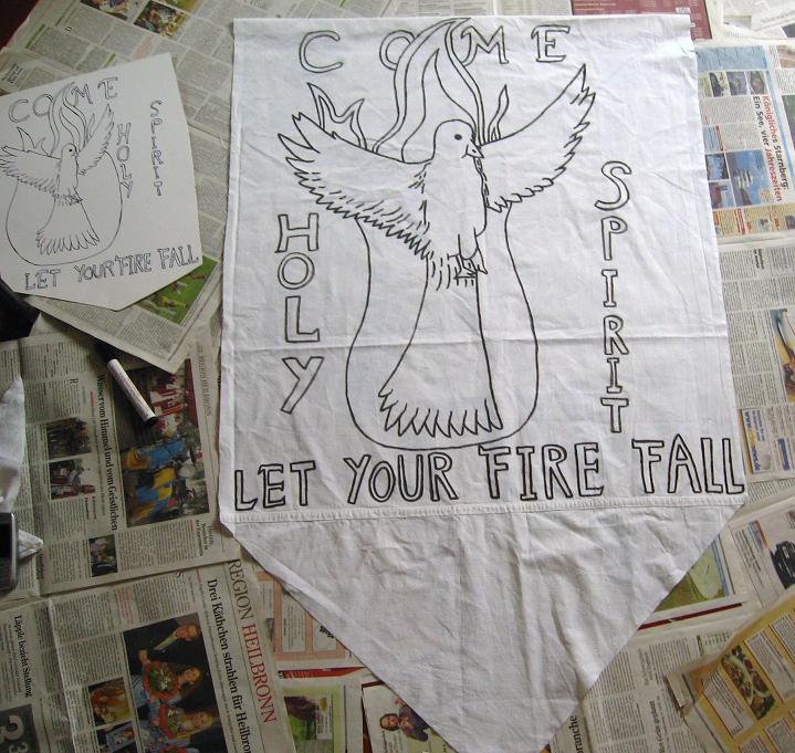 Gestalte ein Banner aus einem Stofflaken und bemale dieses mit Textilfarbe. Aufschrift: „HEILIGER GEIST, lass Dein Feuer fallen“.