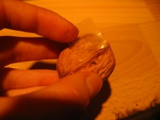 In die Mitte der Walnuss legst Du den kleinen Zettel (notfalls zusammenrollen oder falten) mit der prophetischen Botschaft. Und anschließend klebst Du die beiden Walnusshälften zusammen.