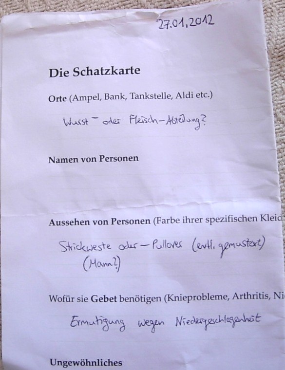 Tobias bekam als Ortsangaben „Einkaufszentrum“ und „Bahnhof“. Er sah eine ältere Frau mit einer roten Jacke und etwas längeren, grauen Haaren. Er bekam dazu den Namen „Edeltraut“ und unter „Wofür sie Gebet benötigen“ den Eindruck, dass sie Probleme mit den „Zähnen“ hat.