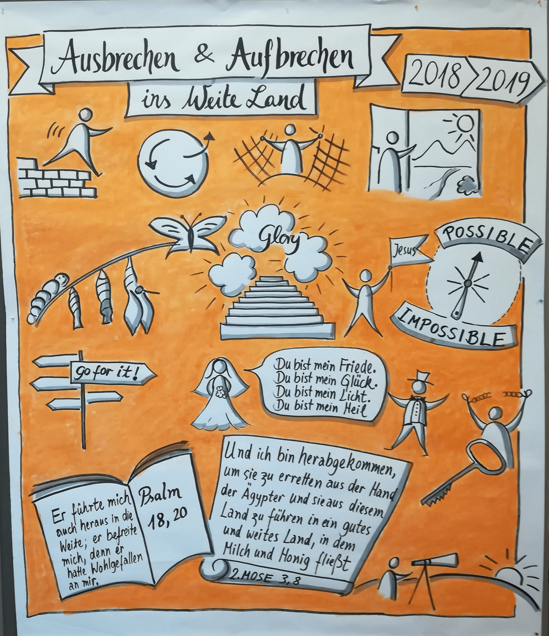 Wir möchten ein Bild mit Euch teilen, das einer unserer Leser zu unserer Jahresprophetie für 2018 „Ausbrechen und Aufbrechen“ erstellt hat. Es ist eine Zusammenfassung der Botschaft, es sind aber auch weitere Eindrücke, Bibelverse etc. eingeflossen. Teile des Bildes beziehen sich aber auch auf das neue Jahr 2019.